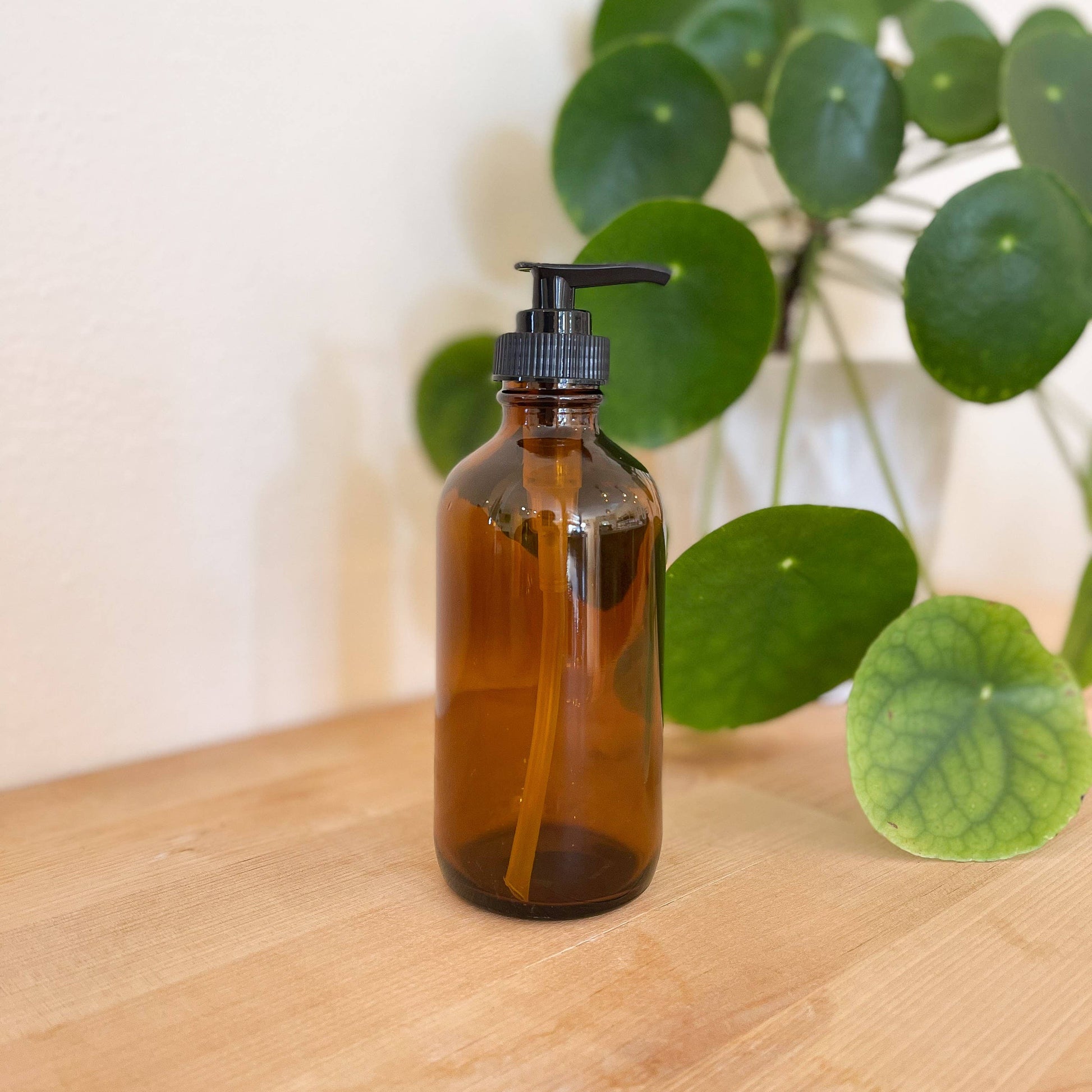 250 ml boston round amber glass bottle. For refill and storage of personal care products. Safe for light-sensitive products. Available with a plastic pump. Great for lotions, hand soaps, homemade product and more!